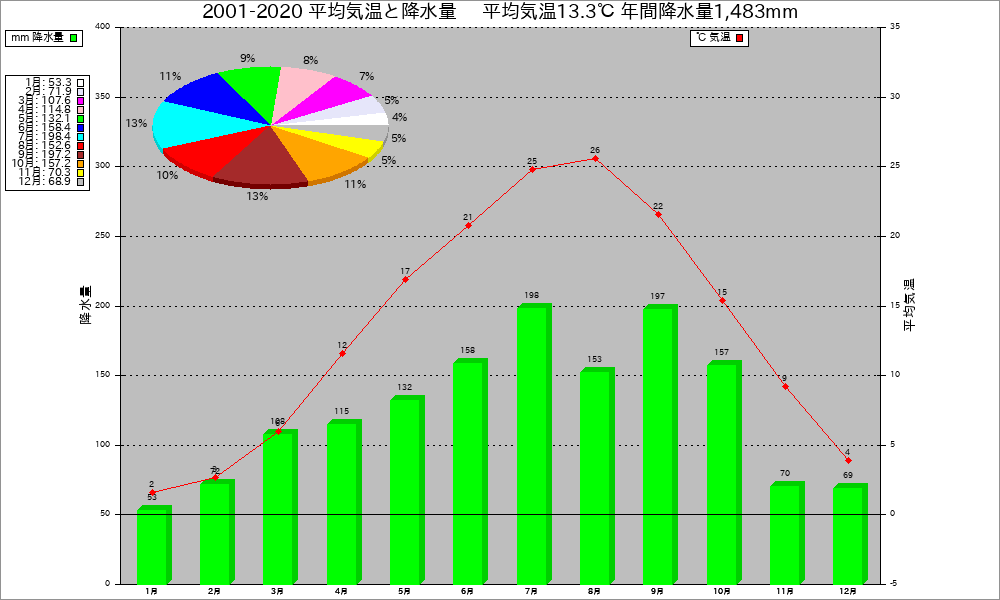 よくわかる雨温図グラフ 平均気温と降水量(年指定) チャート 2023.03.012023.03.17 指定した年の平均気温と降水量の関係をグラフ表示します。下段に示す最近20年間の平均値をとったグラフ(棒グラフと折れ線グラフ)と比較するとその年の特徴がよくわかります。 目次 指定年の気温と降水量2001年から2020年までの平均値ハイサーグラフで見てみよう 指定年の気温と降水量 2001年から2020年までの平均値 ハイサーグラフで見てみよう 気候区分がわかるハイサーグラフでみる篠山の平均気温と降水量の関係気候変動を実感するチャート高校地理にはハイサーグラフという項目があり、大学受験ではこのグラフを元に気候区分をあて、該当する都市名を回答するというのが定番です。難しいはなしは別としてこのグラフは別に記した雨温図の変形版ですが、地域の気候の特徴...